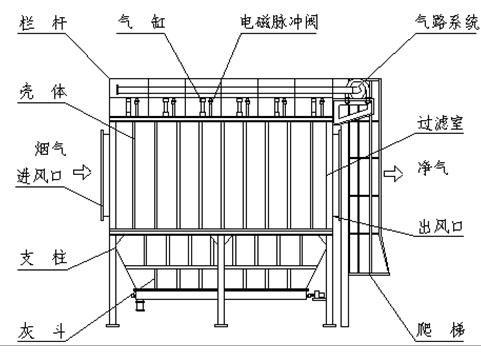 含塵空氣進(jìn)氣口進(jìn)入除塵箱,因氣體突然擴(kuò)張,流速驟然降低,顆粒較粗的粉塵,靠其自重力向下沉降,落入灰斗。細(xì)小粉塵通過各種效應(yīng)被吸附在濾袋外壁,經(jīng)濾袋過濾后的凈化空氣,通過文氏管進(jìn)入上箱體,從出氣口排出,被吸附在濾袋外壁的粉塵,隨著時(shí)間的増長,越積越厚,除塵器阻力逐漸上升,處理的氣體量不斷減少,為了使集塵器經(jīng)常保持有效狀態(tài),設(shè)備阻力在一定的范圍內(nèi),就需要清除吸附在濾袋外面的積灰。