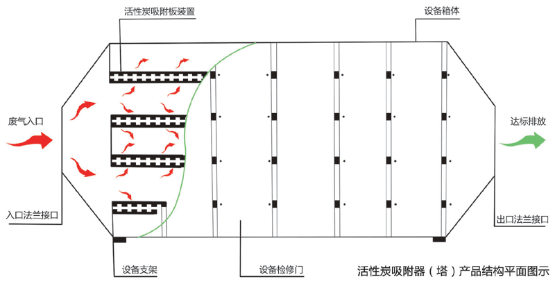 當(dāng)有機(jī)廢氣氣體由風(fēng)機(jī)提供動(dòng)力,正壓或負(fù)壓進(jìn)入塔體,由于活性炭固體表面上存在著未平衡和未飽和的分子引力或化學(xué)健力。