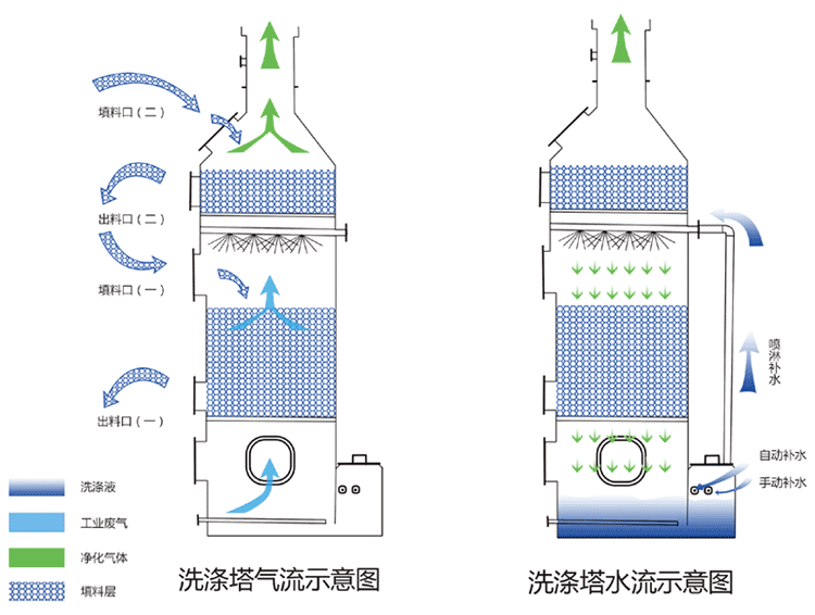 氣流中的粒狀污染物與洗滌接觸后,液滴或液膜擴散附于氣流中的粒子上或者增濕于粒子,使粒子借著重力、慣性等作用達到分離去除的目的。氣態(tài)污染物質(zhì)則借著絮流分子擴散等質(zhì)量傳送,以及化學(xué)反應(yīng)等現(xiàn)象傳送洗滌 液體中達到與進入流分離的目的,并可在洗滌液中添加化學(xué)物質(zhì),以吸收方式控制氣狀臭味物質(zhì)。廢氣經(jīng)由填充 式洗滌塔和洗滌液進行吸收中和(利用填充物増加接觸表面積),以去除廢氣中的有害微粒物質(zhì)。